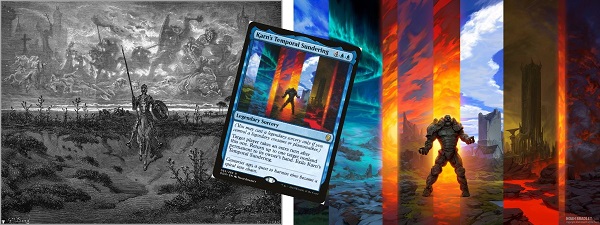 Ryan chose a piece by Gustaf Dore, a famous woodcut illustrator. I wound up collecting some images of Dore's work and using them for a few of my header artworks. The unique woodcut style presented challenges that were fun and pushed me to modify the art from Magic cards in new and interesting ways.