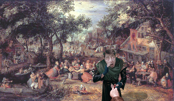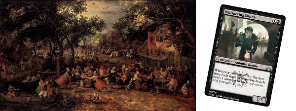 The original art was Kermis by David Vinkboons from 1605. My source material usually isn't quite that old and usually doesn't have quite this much activity. I decided to try putting Jason Rainville's Whispering Snitch into the foreground.