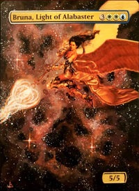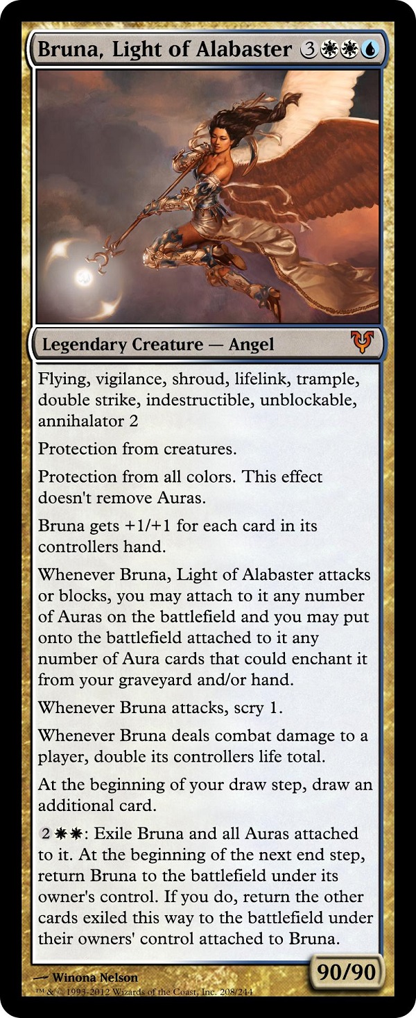 ) this 5/5 Angel has Flying and Vigilance. That's all well and good, but the next part is where she can get a little crazy. When Bruna attacks or blocks, you can attach any number of Auras on the battlefield, in your hand or in your graveyard onto her. That means you can steal any auras you want to steal and you get to cheat the casting costs for each and every aura in your hand and in your graveyard.