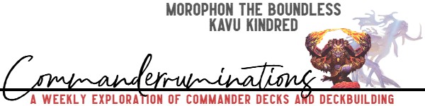 Morophon, the Boundless puts us firmly in five colors. It's a changeling, so it is every creature type, and when Morophon enters I'll choose a creature type (Kavu). Spells of the chosen type cost WUBRG less to cast, and that reduction only affects the amount of colored mana I pay. It also gives a +1/+1 anthem effect to other creatures I control of the chosen type.