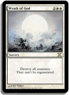 In order to use these abilities property, you need to take advantage of your opponent’s fears. Because your opponent is afraid to put himself in a situation in which he is too far behind, just the threat of putting him in that situation (the threat of Wrath) can be extremely effective. If you threaten Wrath of God on the proper front (whether it is tempo, card advantage, or just removal), you can effectively deny your opponent actions based on how afraid he is of the card. This is how the various abilities and properties of the card intersect.