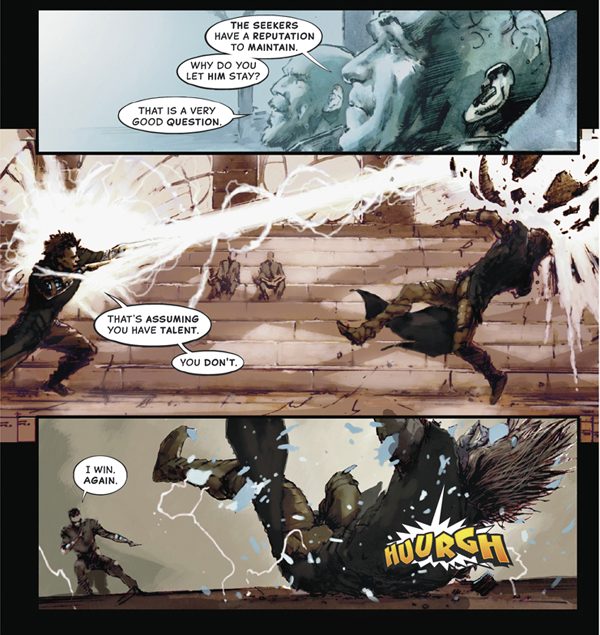 The guards who found Tezzeret with the Codex did not attempt to take him prisoner or lock him away. The Seekers were tired of the “boy from Tidehollow.” Instead, the guards brutally beat Tezzeret and strived to kill him. He was saved only by his spark.