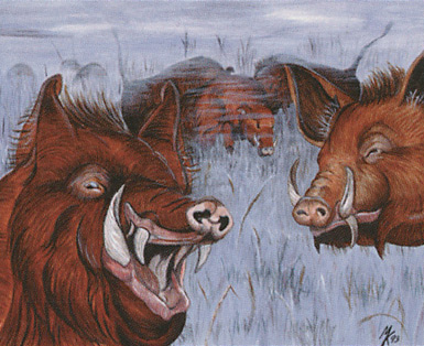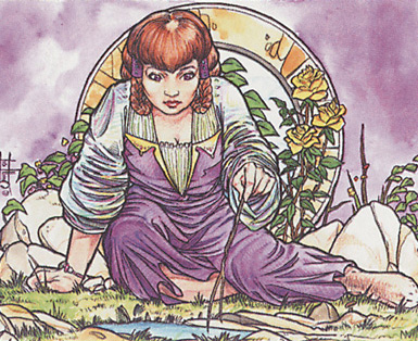 This is a very rare painting. Amrou Kithkin hardly ever leave their communities, and allow few to enter. Shorter than humans, with a large nose and hairy feet, Dominarian kithkin are simple and honest. Currently, they are struggling to rebuild their homes after the Phyrexian Invasion.