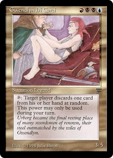 Gwendlyn Di Corci’s art is interesting in that it shows a hyperaggressive take on seduction. We start with her because she’s the Elder Stateswoman of Magic seductresses, or at least the most notorious and blatant. Granted, Gwendlyn’s “suitor” pictured doesn’t look like much of a swordsman, but a conquest is a conquest, and according to the flavor text, Gwendlyn has a long history of success. She looks downright threatening, and her buzzed mullet is pretty intimidating.