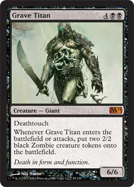 4. Grave Titan - When Captain of the Watch was confirmed as MIA in M11, a suitable replacement was in order. Not everyone will see the connection, but it is there. CotW put nine power on the battlefield spread across four creatures for six mana, an amazing value. The GT actually one-ups the white lord by throwing ten power on the table from three creatures, for the same mana-cost, and the possibility of infinitely more. More power, more creatures, more everything. This Mythic is more than a replacement, he is an upgrade. Put it this way, there will be an open sleeve for this monster in almost every black-splashed EDH deck out there.