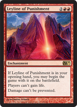3. Leyline of Punishment - Taken as a whole, the Leylines of M11 are pretty impressive. The ultimate side-board friendly enchantments – cards that can give you a needed boost, or really screw your opponents strategy, and sometimes manage to do both at the same time. Of the five, Punishment stands out above the others for one reason: Red Deck Wins. A recent flurry of Top 8s and PTQ wins (according to dailymtg.com) mean the tried and true Burn Deck is alive and kicking. Leyline of Punishment gets the nod at #3 because it will be an auto four-of in every RDW side-board. And it’s free half the time as an added bonus.