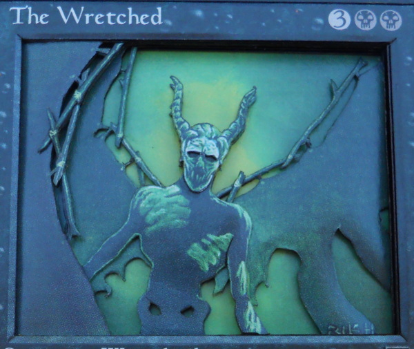 Currently, I’m experimenting more with forming and shaping the layers and detail pieces I cut. I’ve done this in small ways in the past—for example, by curving the eyeball of the Gitaxian Probe I made a couple months ago. Thanks to some advice from Eric Klug, I recently picked up a set of pottery tools, which I’ve been using to give some of the pieces I cut more individual depth. The first card on which I used the tools was this 3D The Wretched: