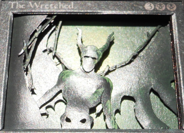 The Wretched’s body, head, and wings all have some depth added by shaping the pieces. The border of the art box is also slanted down in the top layer, something I have never done before. As mentioned in the previous tip, a shot with direct light makes these changes more obvious: