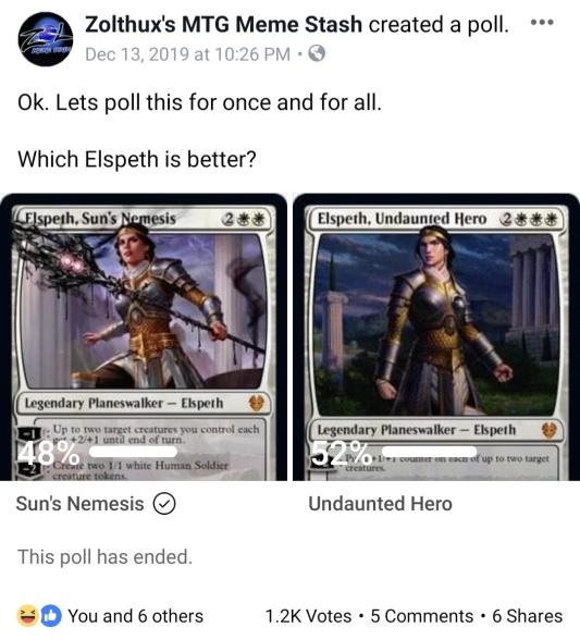 Elspeth, Sun's Nemesis - in my Throne of Eldraine review, I briefly talked about how Elspeth, Sun's Nemesis was underrated based on experience from when she was leaked. Meme deity Zolthux posted a poll which showed, if anything, a majority of the players had 0 reps with her.