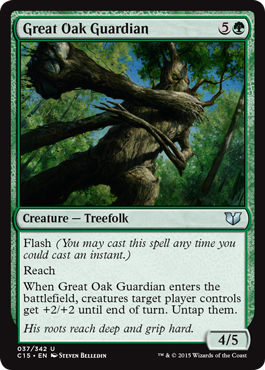 Great Oak Guardian joins green's recent resurgence of green 6-drops to supplement Primeval Titan, and Great Oak Guardian suffers because it isn't a card that is cast and requires action, but it is a great riff on Overrun, as a weakness of that card is that it can be a blank if you have no other creatures. On the other hand, Great Oak Guardian is at least a huge Ambush Viper if need be. It doesn't give trample, but its ability to turn combat while being a standalone threat is nice to supplement Primeval Titan, especially in more mana-Elf ramp decks (as opposed to land ramp). It has nice synergies with Kiki-Jiki, Mirror Breaker and Splinter Twin if that's something you run also. Incidentally, it somewhat outclassed Pathbreaker Ibex since the latter takes a turn to start working.