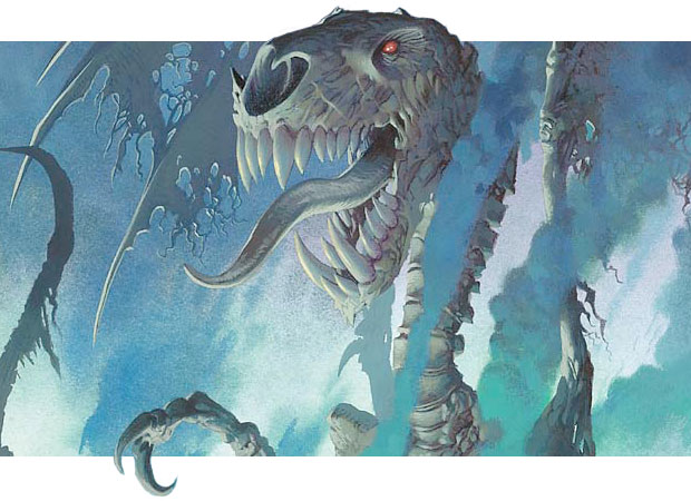Distracted by the pixies’ glamours, Zumaki was ill-prepared to defend himself from a wandering dragon engine left from the Phyrexian war. When the engine attacked, Zumaki was taken by surprise, but the dragon still had his strength. In the short battle that followed, the two dragons destroyed each other, seemingly freeing the pixies, but it was not to be. The dragon engine’s regenerative abilities brought both dragons back from the dead, fused together. With the body of the dragon engine and a crazed version of Zumaki’s mind, the new dragon once again assumed control over the pixies.