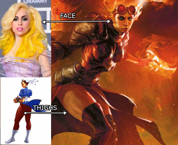 Mike: Is Lady Gaga really a sex symbol? Really? She barely looks like her. MTGSalvation is quick to find connections, but her face does not reference an adult model. Her thighs are developed, as is her chest, yet her face remains youthful. How old is Chandra? (Yes, immortal, as she’s a planeswalker; I get it.)