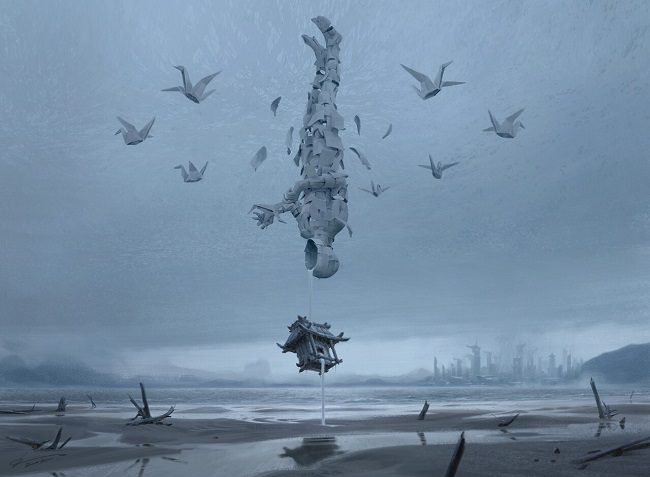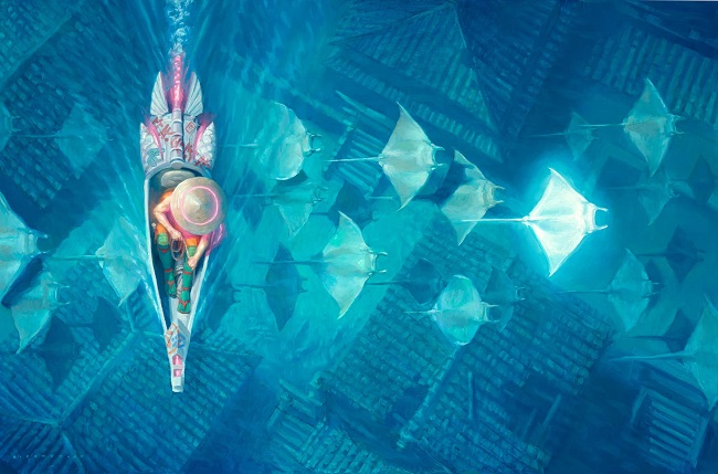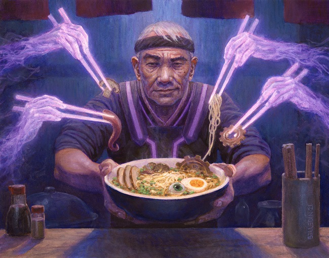 To keep it on Kamigawa, Ryan showed the rooftops, anchoring them with a futuristic boat, showing a fusion of old Kamigawa and new just by a person in a boat.