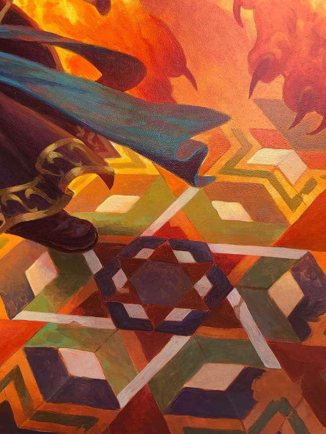 I also was feeling kinda graphic design-y so as a counter to the organic nature of his costuming and the flaming tigers, I went with a hard geometric pattern on the ground. This was one of those rare paintings that came together quickly and smoothly and also turned out to be one of my favorites."