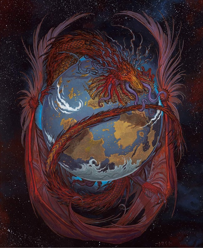 People often look to dragons for the best art, because of the card ability. What also happens is that artists go extra hard on dragons because of that raised focus. Victor did it on a revisit for a boomer level commander that barely sees play, yet brings his S+ tier game to show a dragon primordial, what Rith always was, but wasn't that clear.