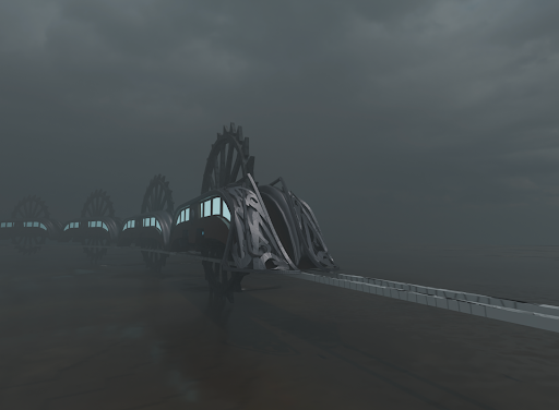 Going back to what I said about the power of the landscapes - I thought about the trips I've taken on trains and what it felt like to move at a certain speed through those gigantic spaces, the silence of the view from the window, the rocking rhythm of the train. More than showing the train itself as the central character of the piece, I wanted to convey the feeling of its movement through the landscape - at different scales and from different perspectives. Once I had sketched out compositions for each land, I decided to build my own 3D of the train in Blender, using the styleguide reference. I placed the camera according to my sketch, and roughly lit and colored the scene without any other elements so I could paint the train with a bit of self-made reference. This actually helps it be less detailed and more impressionistic - without that reference, I would have to do all the perspective construction on the painting itself, which runs the risk of packing too much unnecessary detail into areas that should not be hogging the attention.