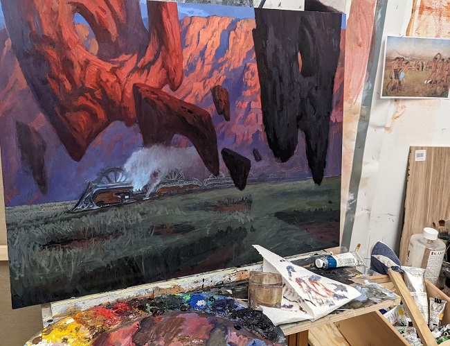 This is again about solving problems at a small scale that would be a pain to fix later in the process. Mostly I am looking to understand color mixtures, especially translating glows and strong colors from the digital sketch and translating those to mixtures in oil paint. Subtractive, physical color mixing in paint has a much more limited range of color and tone than what can be displayed on a monitor, so there is quite a bit of strategy involved in achieving those effects. Also, working on a deadline means there are a limited number of painting sessions I can fit in for each piece, so I can't do that much reworking. Because I work mostly from imagination, I am using all these studies to basically create my own references - then I can tackle the final piece more or less in one process with minimal revisions, and just focus on tweaking color and atmosphere as I go.