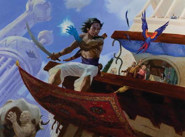 Remember that Christopher Moeller was retired from Magic? That's technically true, though he had a few unused works, slush art that is, which could still find a home. This lovely illustration of a man atop a flying carpet found a home in Modern Horizons.