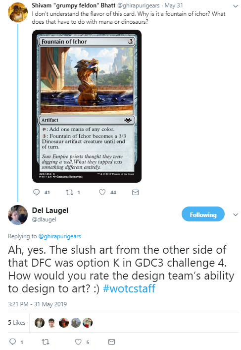 Modern Horizons didn't just provide a home for unused art from the long past. A couple more recent pieces waiting for their time to shine found a home as well. Fountain of Ichor was made for Ixalan, likely in the slush art pile, like many unused masterpiece cards reassigned or still waiting for the right set. Wizards editor Del Laugel mentioned the other side we already know, because we've seen it before, with an appearance from Shivam Bhatt's MTG Twitter account: