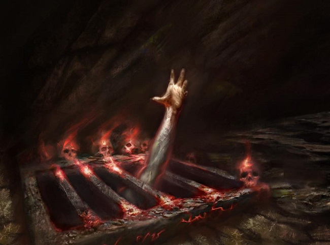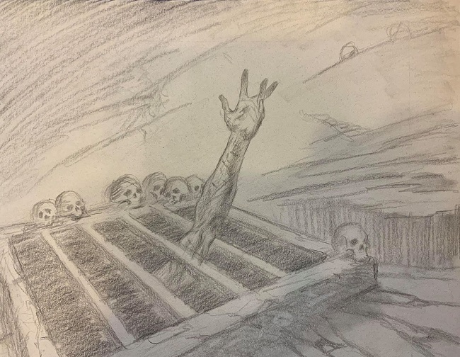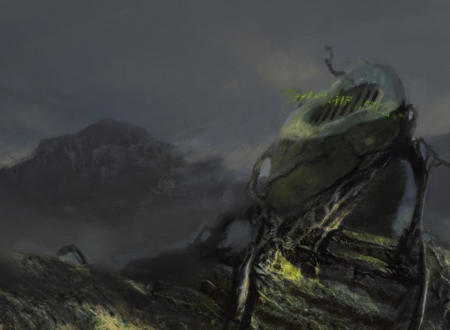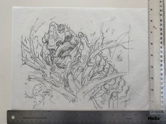 The description was mostly about the creature over the setting. It described what we essentially know as Batterskull. Time was a little tight on my end so I noodled over it in my head a little bit and did a series of sketches that are built up on tracing paper or vellum. I submitted one cleaned up sketch and that worked with a few notes on what to focus on. I referenced the two previous arts with mine.