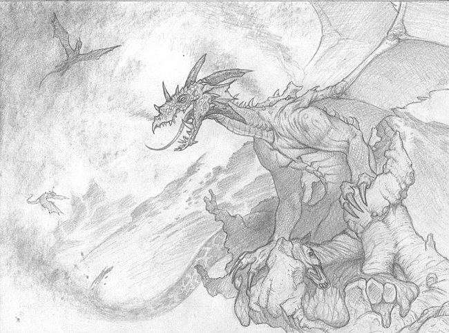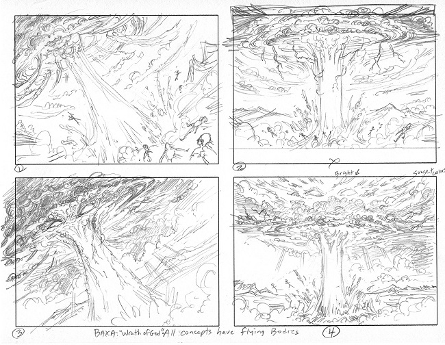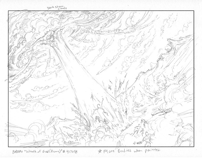 I don't do a lot of sketches for a job, unless I really feel the need. I usually give it some thought and then start drawing, and turn in one well-thought-out sketch which is what I did for Metamorph and Sword of F&F. On wrath of God, they wanted the eyes of God in the clouds, so I did a couple of smaller sketches first. Thankfully they decided to let me do the painting with just the clouds, I think it's stronger that way.