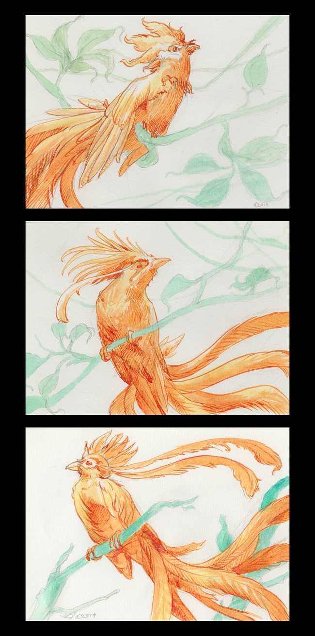 O: This bird has a tail so long when it flies it flutters and it's almost as if you're seeing a snake flying! Also, bright colored birds are a very common feature where I grew up, so I had a clear idea of how a Bird of Paradise would look. I chose to draw a bird that would look regal, proud and even uncannily intelligent.