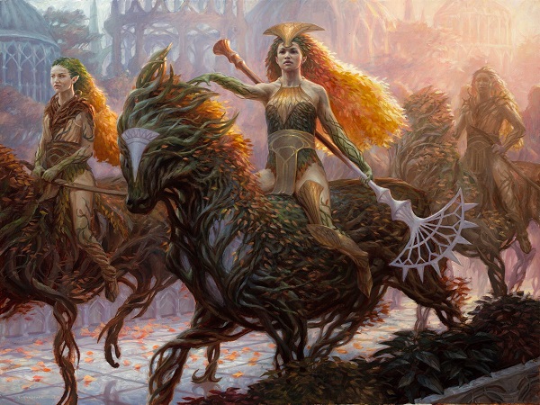 This is a masterpiece painting. The light on the leaf hair alone explains why this sold for over $6000 at auction. The three dryads are now more warrior based, while keeping the Selesnya lightness of organic strength. They're beautiful and terrifying. No one smiles, everything is serious, and some ish is about to go down - that lance is the spiked one, not the one for crowd control that's dull.