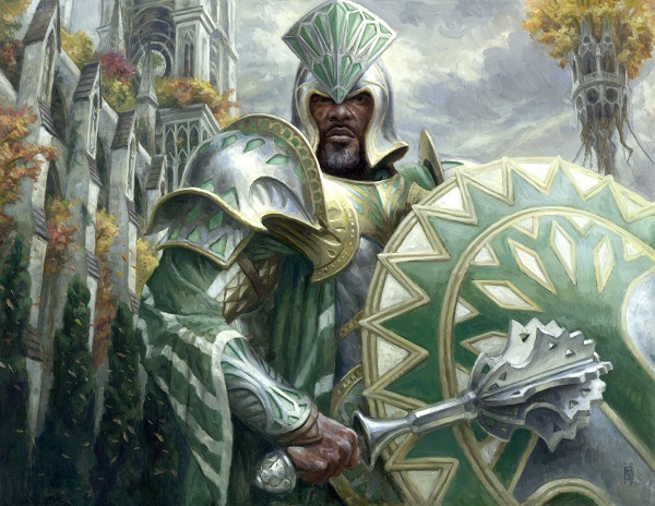 What a lovely Ravnica illustration. It has the characteristic flying buttresses filled with Selesnya trees, the stained glass/enamel guild symbols and a fall hue to it, showing us autumn's dreary skies. His wisps of white beard show his battle hardened nature, reinforced by both a mace and his weathered hand. This is a lovely image and being Selesnya myself, it's exactly what you envision instead of tree huggers. They're the wall, the brute "no" when it comes to battle to protect their own.
