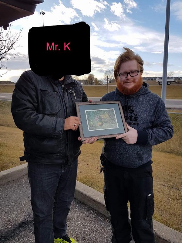 On October 22, 2017, I'm flying for work overseas. I land in Chicago at 5pm. John and I had been chatting via wifi on my flight and he was keeping me up to date on the meeting point. I'm pretty excited, as you can imagine. When I land I realize I have to change from concourse B to C it's a bit of a walk and we had landed ten minutes late, so I rush to the gate when I get a message from John that K is 20 mins away. My heart skips a beat as I'm finally letting myself get excited. When I arrive at the gate I see they are already boarding group 1 and I'm in group 2 so I get in line. As I board the plane John tells me he's heading out to the meeting point. Depending on when they meet I'm not sure if I'll see the painting in John's hands before or after I land. At this point all I can do is wait. Sure enough, about 25 minutes later as I'm sitting on the tarmac, John sends a picture of him and K holding the painting.