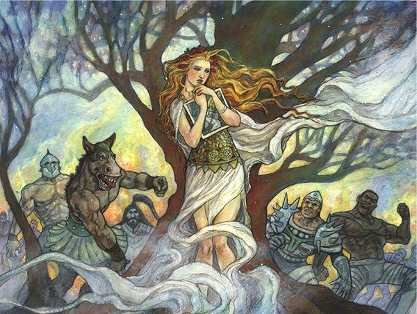 As you attempt to prove wrong the good vs. marginal Foglios, look for the shortcuts in a character design in Runed Arch, or large brushstrokes that are unfinished in Redwood Treefolk. Those artworks were a product of the time, but they were also necessary to see what could happen when open-ended descriptions were made, like Renewal, an utterly beautiful work. The intentionality isn't there, making whimsy a gag, not a planned surrealistic escape or optimistic concept during a card game duel. When there was no correct, there was often a better created piece and a rushed job in the same set. That was allowed then. These days, you'd commission the person to fewer cards and raise the bar for quality.