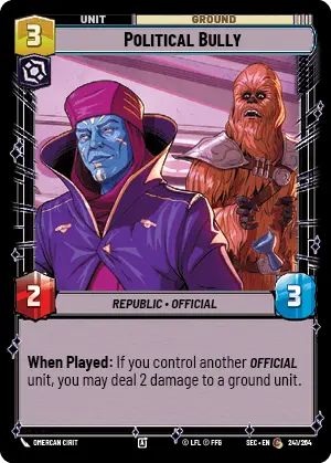 We've seen a host of 3-cost units with 2/3 stats. Political Bully is no different, except if you control another Official. Getting early removal for ground units is powerful, and removal on a body is great card advantage. That's doubly true in limited, which makes this card worth a pick every time.