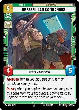 Imagine if action economy was ground up into a single card and you'd get something close to Dressellian Commandos. 5-rescoures for a 4/5 might not be all that enticing at first blush, but having Ambush already makes this a card worth considering in Commando/Heroic. Giving it Plot to Ambush on the same action as deploying your leader makes this unit a serious tempo changer.