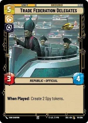 We haven't mentioned many late-game units or finishers so far, but Trade Federation Delegates broaches that line. As we established earlier, bodies win games. The Delegates bring 2 Spy tokens with them amassing 7 damage (while attacking) for just 5 resources.