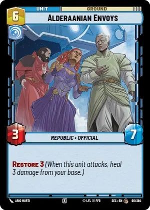 There aren't that many Restore 3 effects in the game so far. Finding one at common with a massive 7 HP is a feat amongst units. The Envoys only being in Vigilance (instead of also being Heroic) begs for this card to be played as much as possible. Frankly, with 3 attack the 6 point swing with a single action might make or break games.