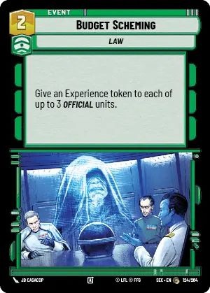 Back in Spark of Rebellion there were a lot of folks still running Medal Ceremony in Premiere. Even into Shadows people debated on whether Medal Ceremony was worth playing in the format. What was never up for debate was playing Medal Ceremony in Limited. Budget Scheming is simultaneously more and less specific than Medal Ceremony. But more than that it poses a hilarious notion of Palpatine and Thrawn in finance meetings aboard the Death Star debating tariffs from the Trade Federation.