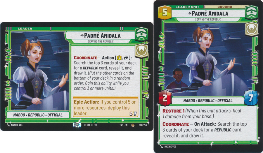 Padme Amidala - Serving the Republic is a Command Leader with a 1 resource-cost ability locked behind Coordinate to let you dig into your deck for Republic cards. This lets her grab late-game high cost units and also Republic Events and Upgrades. Unfortunately, this otherwise great power is locked behind Coordinate meaning that you'll never use it the first turn, and you'll be unlikely to use it second turn which are the crucial turns this would shine. Thankfully, Padme can be deployed with only 5 Resources and has Restore 1 on her unit side to keep you alive. However, her ability to dig is still locked behind Coordinate. That restriction alone makes Padme one of the weakest Leaders in the new set.