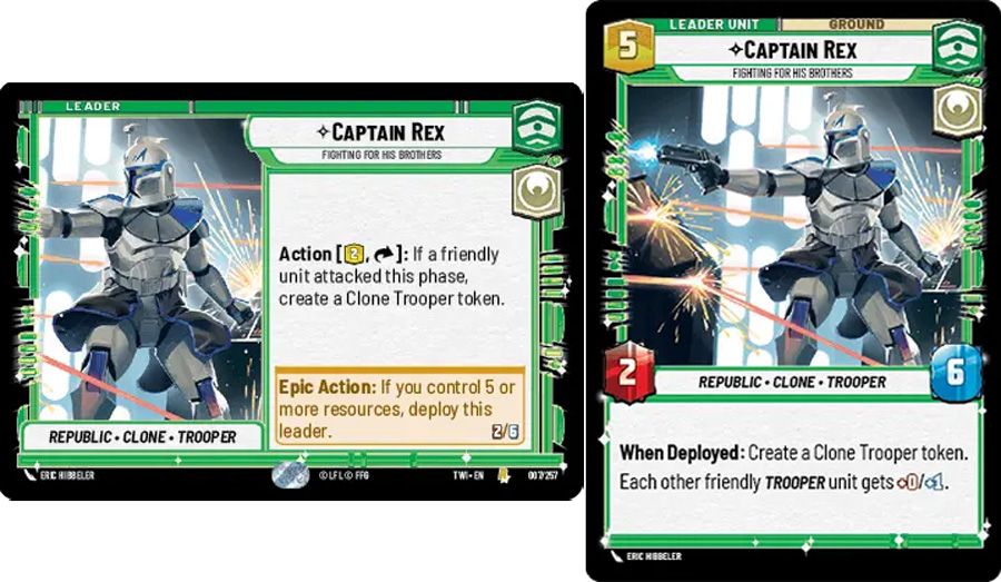 Captain Rex - Fighting For His Brothers explores the Clone Trooper strategy in the most straightforward way. The ability to produce token units is powerful, and when he's deployed he acts as a banner for those units to make them much stronger. However, like his Command Leader counterpart Padme, this ability is locked behind a restriction and a steep cost of 2 resources. Rex can only produce one of these tokens when another friendly unit has attacked. When he deploys that unit production grinds to a halt, as he only gets to make one when he deploys. A true token unit deck wants engines that produce tokens and not a single one-time use Trooper.