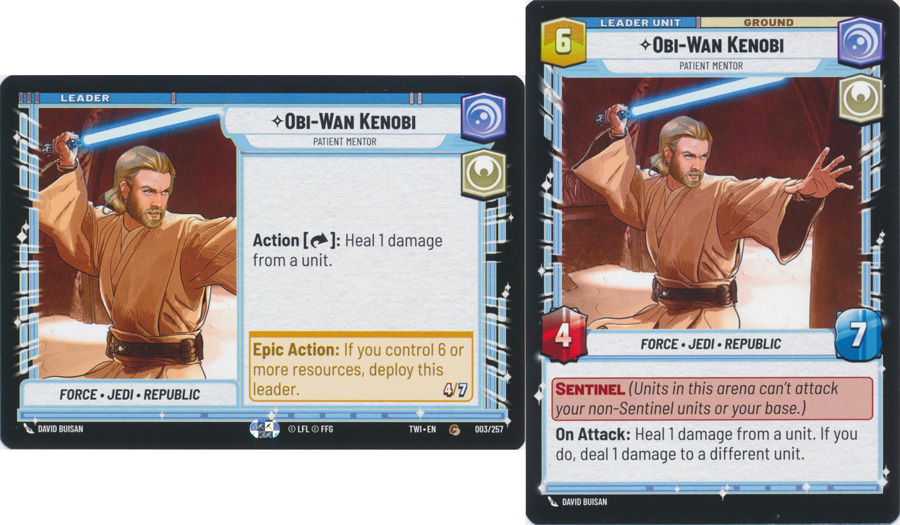 Obi-Wan Kenobi - Patient Mentor has some potential, particularly in the niche combat between Clone Troopers (which are 2/2) and Battle Droids (which are 1/1) with his ability to heal 1 damage per turn. This creates amazing flavor, but in practice isn't quite effective enough. On his unit side Obi-Wan protects his Clone Troopers with Sentinel and 7 Health, but more importantly he learns to deflect damage from his troops and not just heal. Obi-Wan also comes with a suite of effective keywords like Force and Jedi, which particularly flourish in Vigilance.