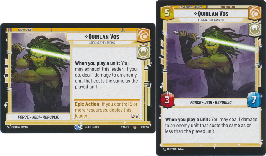 Quinlan Vos - Sticking the Landing is another interesting leader that has a lot of chatter. Heroic Cunning is in a strange place in set 3, with some of the same top end cards seeing play in set 1, which have slowly become less relevant. However, Quinlan has built in removal that helps cover some of the gaps in that combination. And his ability to continuously ping on the unit side makes him a machine of 1 damage instances.