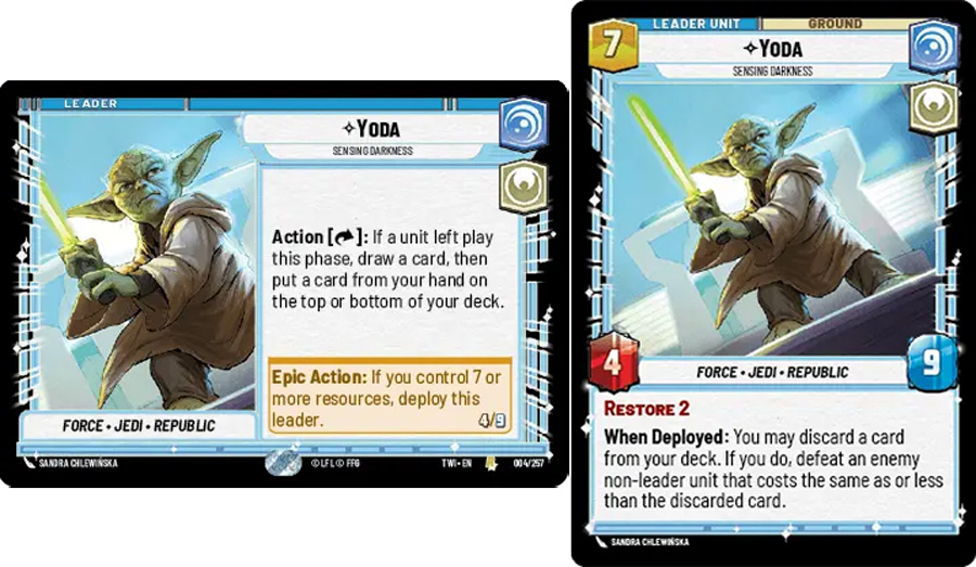 Yoda - Sensing Darkness was the talk of the town during spoiler season, and has come home to roost. Many competitive players have built different combinations of Yoda to set up a good draw. That on its own is powerful - but his free removal when deploying takes him to the next level, allowing incredibly powerful bursts in a single turn just like Boba Fett used to do. Giving Yoda 9 Health and Restore 2 seems like icing on an already great cake.