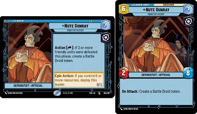 At the bottom of our rankings is the Vigilance common Nute Gunray - Vindictive Viceroy. Battle Droids are simple 1/1 Villainy units - they're fodder for a deck filled with Exploit. Unfortunately, Nute's ability to make these simple units is heavily restricted behind an Action that requires exhausting and for two other units to have already died. This becomes much better on his flip side, but even producing a single Battle Droid isn't enough to keep him exciting.