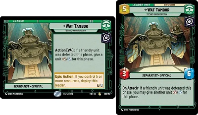 Wat Tambor has some weird promise. His ability boosts a unit for a whole phase, allowing them to take advantage of cards like Overwhelming Barrage and Strike True. However, this ability is again gated behind having a unit die. Admittedly, Command has better options to Exploit so that sacrificing units is more under your control. Wat also deploys earlier in the game - the same turn you could play Overwhelming Barrage, allowing you to stack his front and back side buffs for +4/+4. However, in the current meta this isn't quite consistent enough.