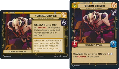 Our villainous starter deck leader, General Grievous, explores interesting space that IG-88 explored in Spark of Rebellion. 3 sets in and we have plenty more droids, and massive droid spawning machines thanks to the Battle Droids. Handing out Sentinel to a single droid (and +1/+0 on the deployed side) isn't enough to warrant a deck focused around other droids. While others might slam Grievous as unplayable - the truth is there are enough decent droids that you might want to die. It might not be competitive, but he's far from the worst leader in the set.