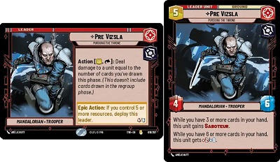 Returning to an interesting mechanic, let's talk about everyone's favorite Mandalorian turned bad guy. Pre Vizsla wants something strange for an Aggression aspect deck. Draw more cards: deal more damage. Villainy gained some card draw in Shadows of the Galaxy with No Bargain, and there are other options when thinking about what base to pair with him. Given the turn structure in this game, drawing at the end of the turn works against Pre Vizsla - Pursuing the Throne. You'll need to make a steady engine to make his ability worth using. I've seen a few attempts at making a competitive Pre Vizsla deck - but each one seems to fall short of consistency. Hopefully Aggression or Villainy will get a good draw engine soon to bring this one up a notch.