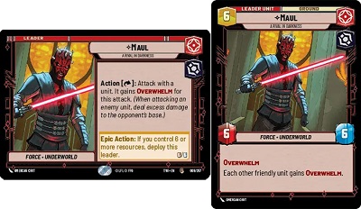 Maul. This one should be no surprise. Dealing damage to the enemy base is pretty good. Maul - A Rival in Darkness wants to hit the enemy base a lot. You get access to Aggression cards that have high attack, meaning your overwhelm damage will always be useful. Deploying any earlier than 6 resources would've made this leader a monster, but giving all your units overwhelm is game changing if you can keep him on the board long enough to get a few hits in. Maul's weakness is in his own fragility.