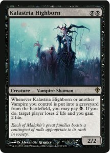 I had the chance to sleeve up a new Vampires list over the weekend when I was at the Lexington, KY PTQ, and it taught me two things: 1) Urge to Feed is completely bonkers, and 2) Kalastria Highborn is still good, but not as good as I thought. Vampires uses a lot of its mana, usually all of it, every single turn. Highborn's trigger cost can really wreck your mana curve, but it becomes highly relevant in the end-game. The fact that Vampire Hexmage can now sacrifice to Vicious Hunger your opponent is more relevant than you might think. Highborn is still important, but I'd revise my previous outlook to something slightly less rosy.