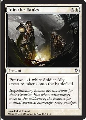 Join the Ranks - At first glance Join the Ranks appears to be a lame token generator in line with Cenns Enlistment. Not so, good friends, definitely not so. Slide this ambiguous four-drop into an Ally deck and Oh the Places You'll Go! Worse case scenario would be putting two +1/+1 counters on each creature you control. At best Join the Ranks can be used to completely turn a game when a dominant ally like Kazuul Warlord or Hagra Diabolist is present. Beyond that, JtR looks to affirm more allies coming in Worldwake (lots more in fact, the Orb of Insight lists 21 uses of the word 'ally'). Join the Ranks will likely see its most use in sealed competition, where Allies is already a viable strategy.