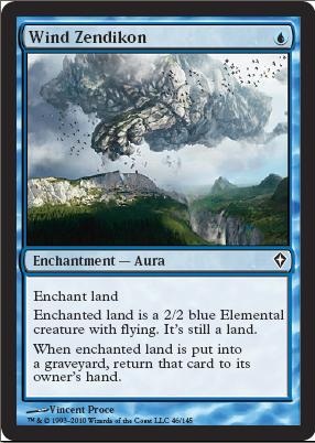 Wind Zendikon - Another solid card that fits nicely in the 'land is fighting back' mold that Worldwake, by its very title is trying to create. Wind Zendikon has both pros and cons compared to its peer animated lands Similar to Faerie Conclave and Genju of the Falls. First among the pros there is very small mana commitment. Turn one you could have a 2/2 flier for the rest of the game without paying anything more. That ties in with the second bonus, WZ can enchant any land, not simply an island making it fairly versatile. Third, when your flier chump blocks or is spot removed you get the land back. Great for landfall activated abilities and makes sure you won't be the victim of a two-for-one. There are cons however. The land returns, and not the enchantment meaning once killed the creature is gone forever. Also because the land is always a creature it falls victim to sorceries and any sweeps. Just enough drawback to keep this one at common rarity.