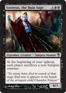 Anowon the Ruin Sage - A legendary vampire, and player in the Zendikar storyline has been released. Anowon is much more useful than his predecessor Kalitas Bloodchief of Ghet. For starters, he costs two less mana to cast, and also... well really that is the only thing. Kalitas was too expensive for any format other than EDH, and Anowon costs a relatively affordable five mana. That doesn't mean Anowon is perfect however, he has a tough road to walk. Not quite good enough to be included in mono-vampire tournament decks, and too specific for limited play (you don't get much bonus here because he only triggers at the beginning of your upkeep). Anowon is still very cool and playable, just don't expect him to be a $20 rare or first picked at FNM too often.