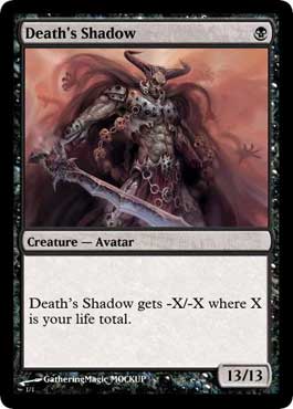 Death's Shadow - Ah, so this is what a 13/13 for one mana looks like. Interesting. Black has scored some very cool and very good cards this week (three of them here), but this might be the top of the bunch. Certainly not useful on turn one or two, Death's Shadow can turn a game on turns four and five. At nine life you get a 4/4 one-drop and the opportunity to use any remaining mana for a second game-changer like Bloodbraid Elf or Mind Sludge. Unlike Phyrexian Dreadnought you're not losing anything you have not already lost. Its creature type (and its anti-life gaining drawback) may keep it out of vampire decks, but Death's Shadow is so good it could find itself in Jund builds or as a lynch-pin to MBC.
